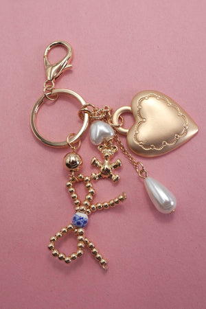 Porcelain Bow Heart Teddy Bear Pearl Bag Charm, featuring a delicate mix of porcelain toile pattern charms, including a bow, heart, teddy bear, and lustrous pearls, this adorable charm is perfect for enhancing your handbag, keys, or backpack. Product Details: Width: 2" Length: 6" Metal finish: gold Plating Product: Lead & Nickel Compliant Anti-tarnish: Double E-coating.