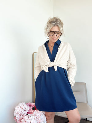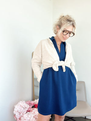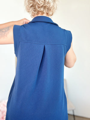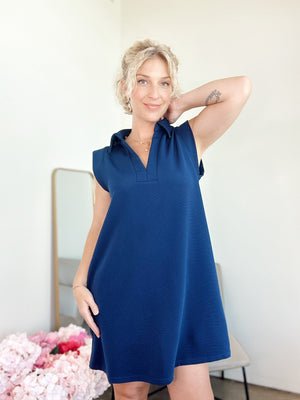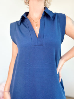 Textured solid collared v-neck sleeveless mini dress featuring pocket at sides. Unlined. Knit. Non-sheer. Lightweight. Available in other colors.