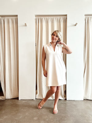 Textured solid collared v-neck sleeveless mini dress featuring pocket at sides. Unlined. Knit. Non-sheer. Lightweight. 95%POLYESTER 5%SPANDEX