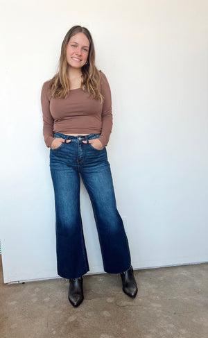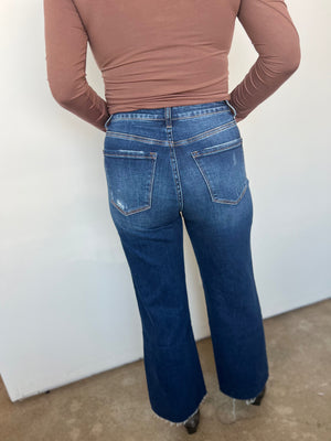 We do love Vervet jeans! These plus size, ankle length, wide leg jeans feature a super high rise waist, raw hem and a tummy control feature with inner panels for shaping and smoothing! We are feeling like this pair runs a little big... size down one if you like your fit tight. Also available in plus size.