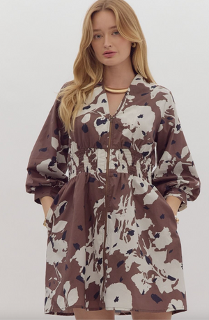This poplin mini dress is exactly what you need and more! It is detailed with a floral print, 3/4 length sleeves, and v-neck. It is gathered at waist with elastic and zipper front.