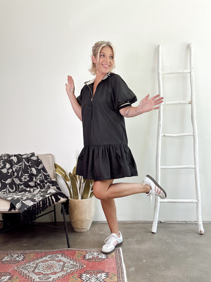 Solid puff sleeve ruffle hem mini dress featuring multicolor accent band and zipper closure at front neck. Pockets at sides. Lined. Woven. Non-sheer. Lightweight.