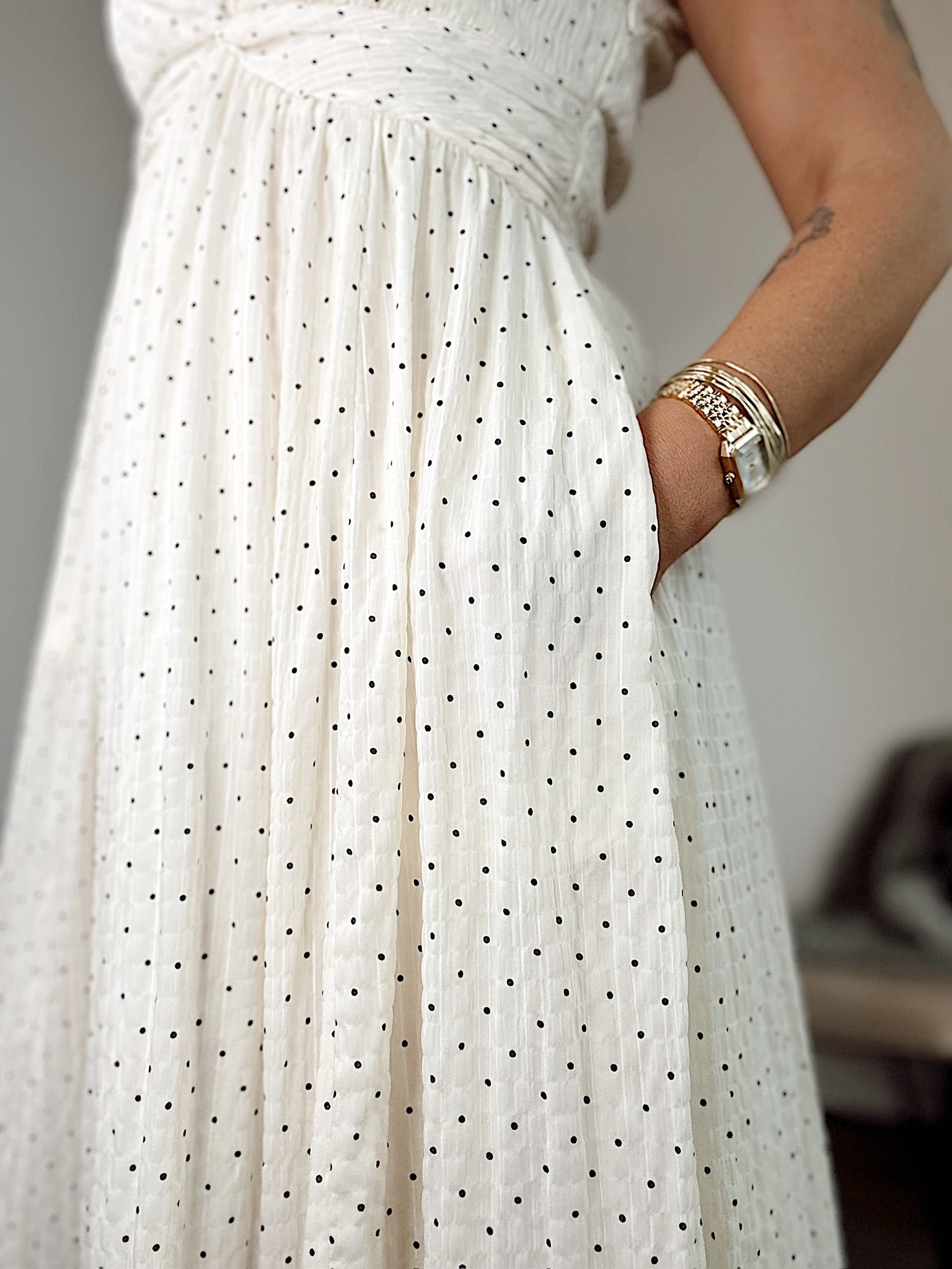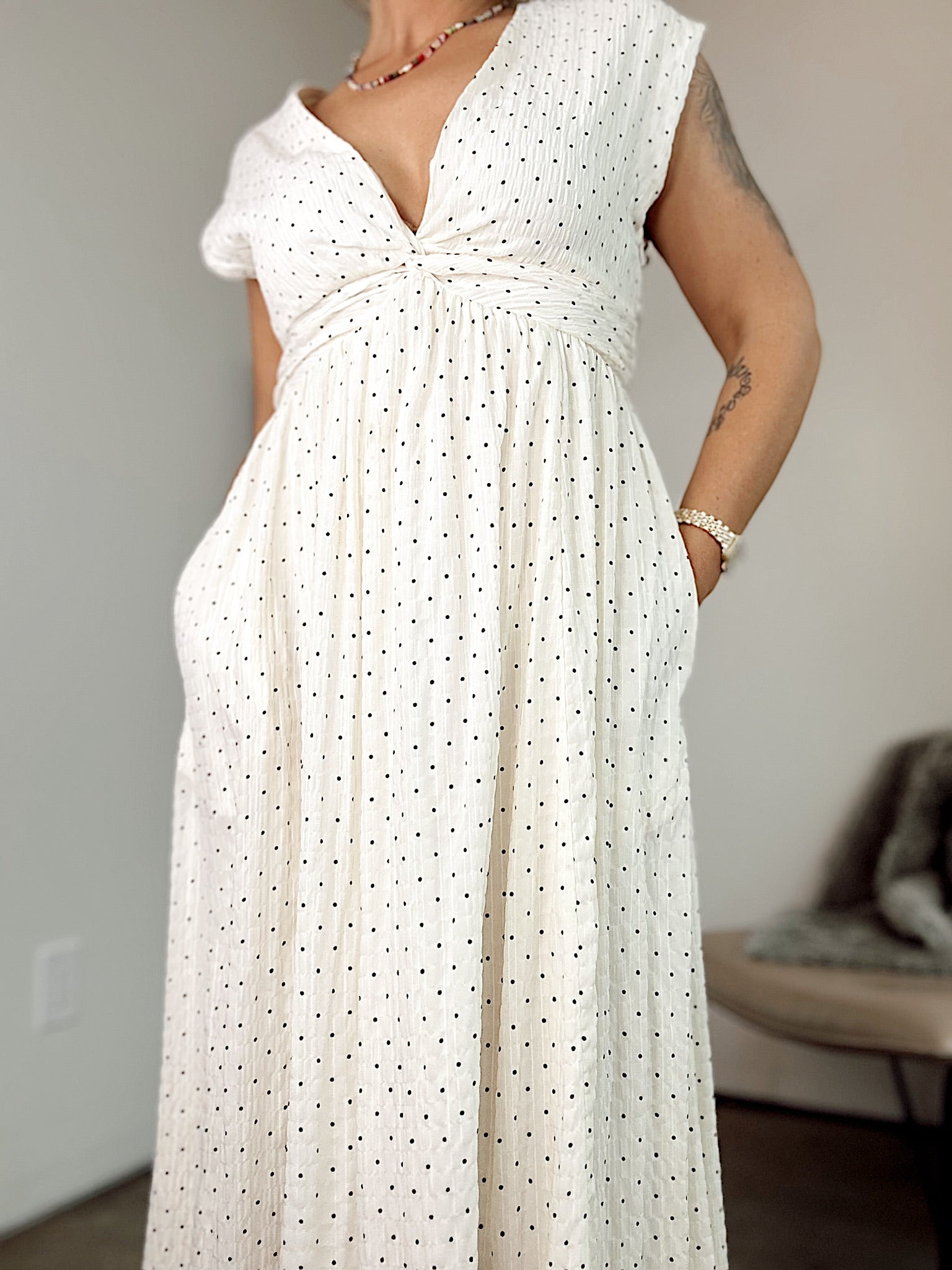 Twirl in timeless style with this charming polka dot maxi dress. The twisted V-neckline and smocked back create flattering dimension, while the textured polyester fabric drapes beautifully for all-day comfort. Lined in soft rayon for a luxe feel against your skin. Perfect for everything from garden parties to sunset celebrations.