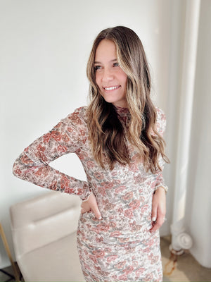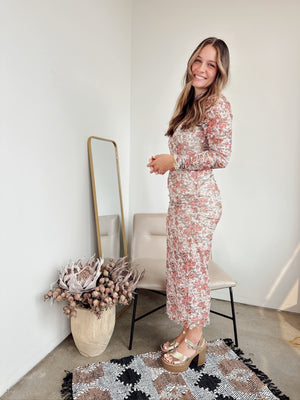 The Hayden Floral Midi Dress brings a playful twist to classic elegance with its high mock neckline and long sleeves, each edged with charming lettuce details. Its fitted silhouette flatters your figure, while the calf-length mesh overlay and partial thigh-length lining add a flirty, layered effect. Perfect for turning heads with floral flair at any event.