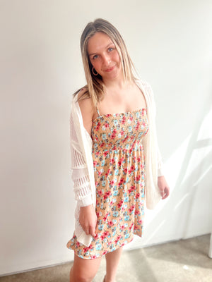 This floral print mini dress is an easy crowd pleaser... with its smocking and ruffle edge details, spaghetti straps (non adjustable) and lightweight and soft feel. This one is non lined, non sheer and comes in another color!