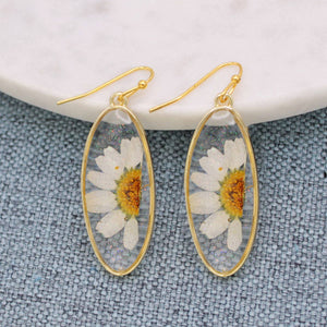 Delicate daisy earrings in winter white. Long oval gold bordered acrylic earrings encasing delicate white daisies, forever preserved in a crystal-clear charm. These nature-inspired beauties bring a touch of elegance to any outfit. • Genuine dried flowers set in clear acrylic • White half daisy flower gold earrings