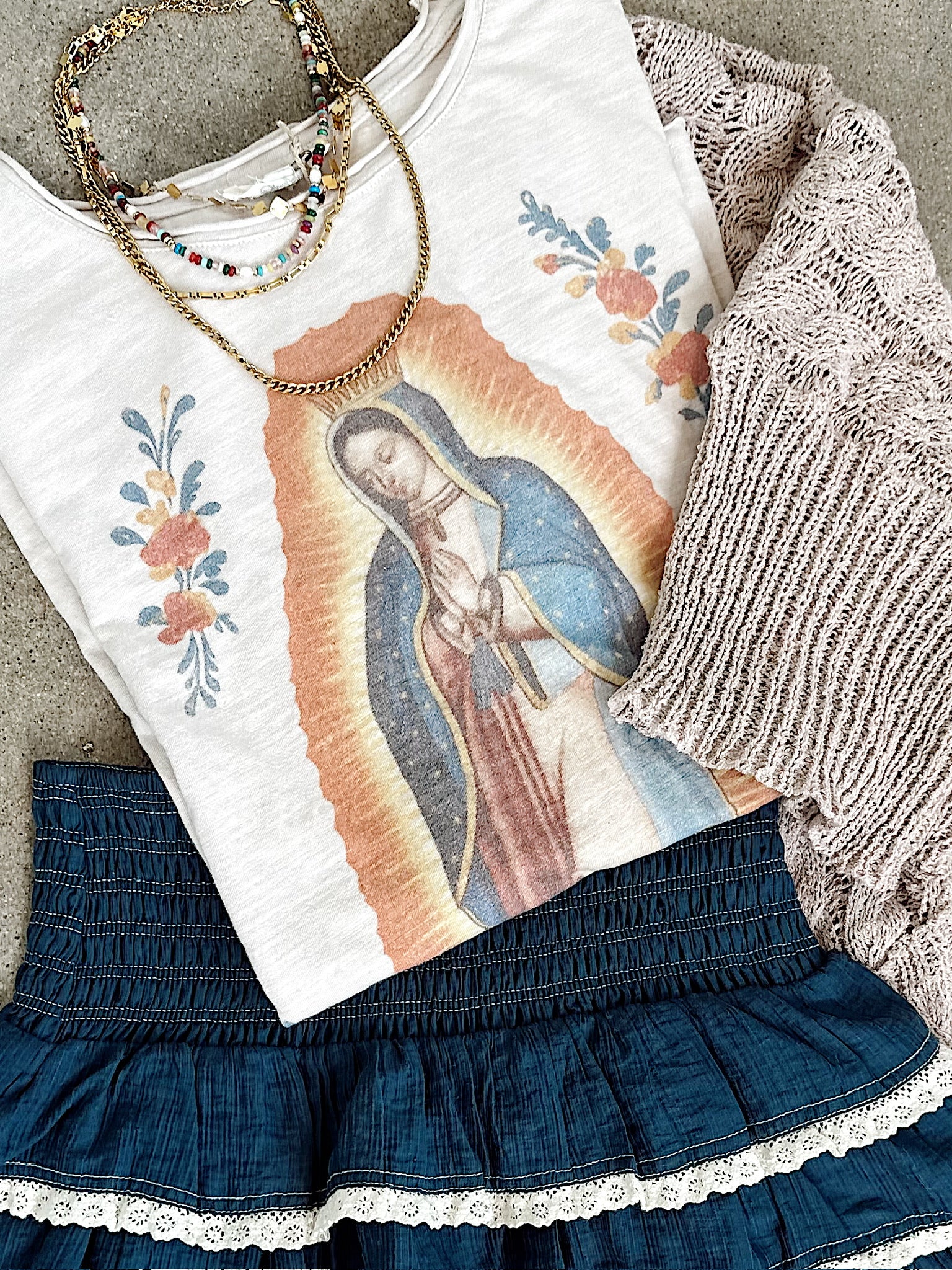 A bold Virgin Mary print sits front and center on pre-washed cotton knit that's soft enough to live in. Dropped shoulders and a relaxed cut mean zero fuss, maximum impact—perfect for anyone who likes their fashion with a wink and a prayer.