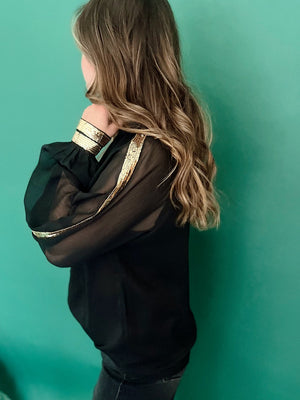 This chiffon top is ready and waiting for all Holiday Parties! It is featuring a mock neck, long ballon sleeve with sequin detailing along the arms and cuffed writs. This top is lightweight, non sheer, and lined on the inside. It runs true to size. Comes in other colors.