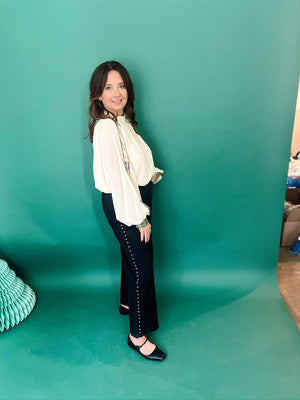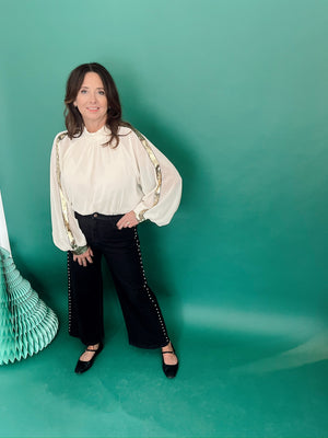 This chiffon top is ready and waiting for all Holiday Parties! It is featuring a mock neck, long ballon sleeve with sequin detailing along the arms and cuffed writs. This top is lightweight, non sheer, and lined on the inside. It runs true to size. Comes in other colors.
