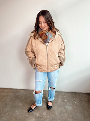 Unique in its own way! This quilted jacket is not like most and has its own twist to it. A quilted jacket in the front and a warm cozy sherpa back and wrists. It is featuring a ribbed folded collar for extra touch, pockets and full zip up. It is detailed with a slit on the side and high to low. This jacket has an oversized fit to it.