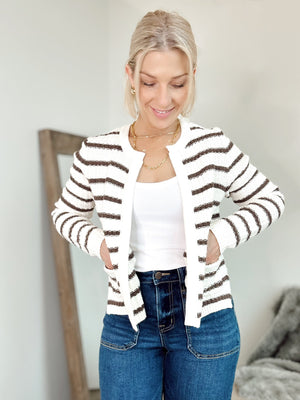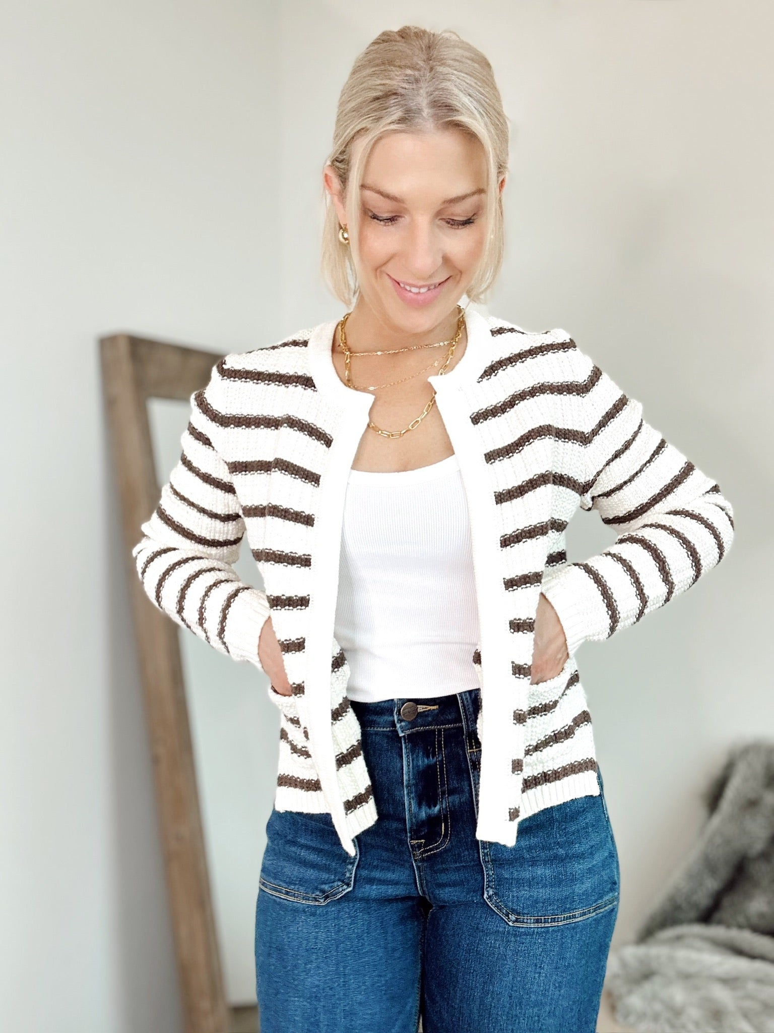 Throw on this striped open cardigan for effortless layering that works with everything. Long sleeves, a relaxed scoop neckline, and textured knit fabric create a cozy, lived-in vibe. Functional front patch pockets keep your hands happy and your style on point. Perfect for those "what do I wear?" moments.