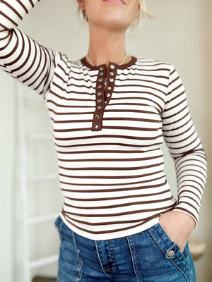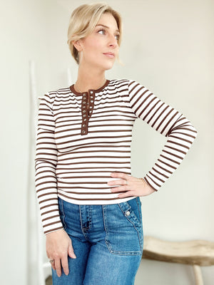 This fitted Bridget Stripe Knit Henley Top in chocolate combines cozy ribbed knit with a fun stripe pattern. Featuring a half snap button front and a playful contrast trim detail, it’s perfect for adding a little flair to your everyday style. Made from a soft blend of rayon, polyester, and spandex, it offers comfort and stretch that moves with you. Grab this top for a charming look that’s as comfortable as it is cute!
