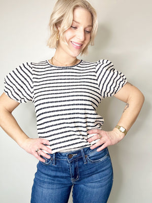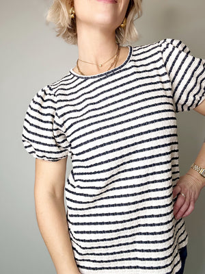 Playful stripes meet effortless style in this charming knit top. The rounded neckline and short puff sleeves with elastic cuffs create a sweet, vintage-inspired silhouette, while the curved hemline flatters your frame. A functional keyhole back with button closure adds an unexpected detail that's both practical and pretty. Perfect for casual days when you want a little personality in your wardrobe.
