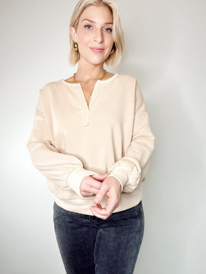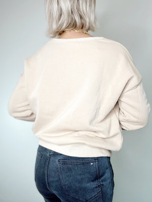 Meet your new wardrobe essential—a relaxed V-neck pullover that's ready for anything. Style it with sneakers and leggings for an easy weekend look, or swap in boots and denim for a polished edge. The soft cotton-poly blend keeps you cozy while a hint of spandex in the ribbed details ensures a comfortable fit that moves with you.