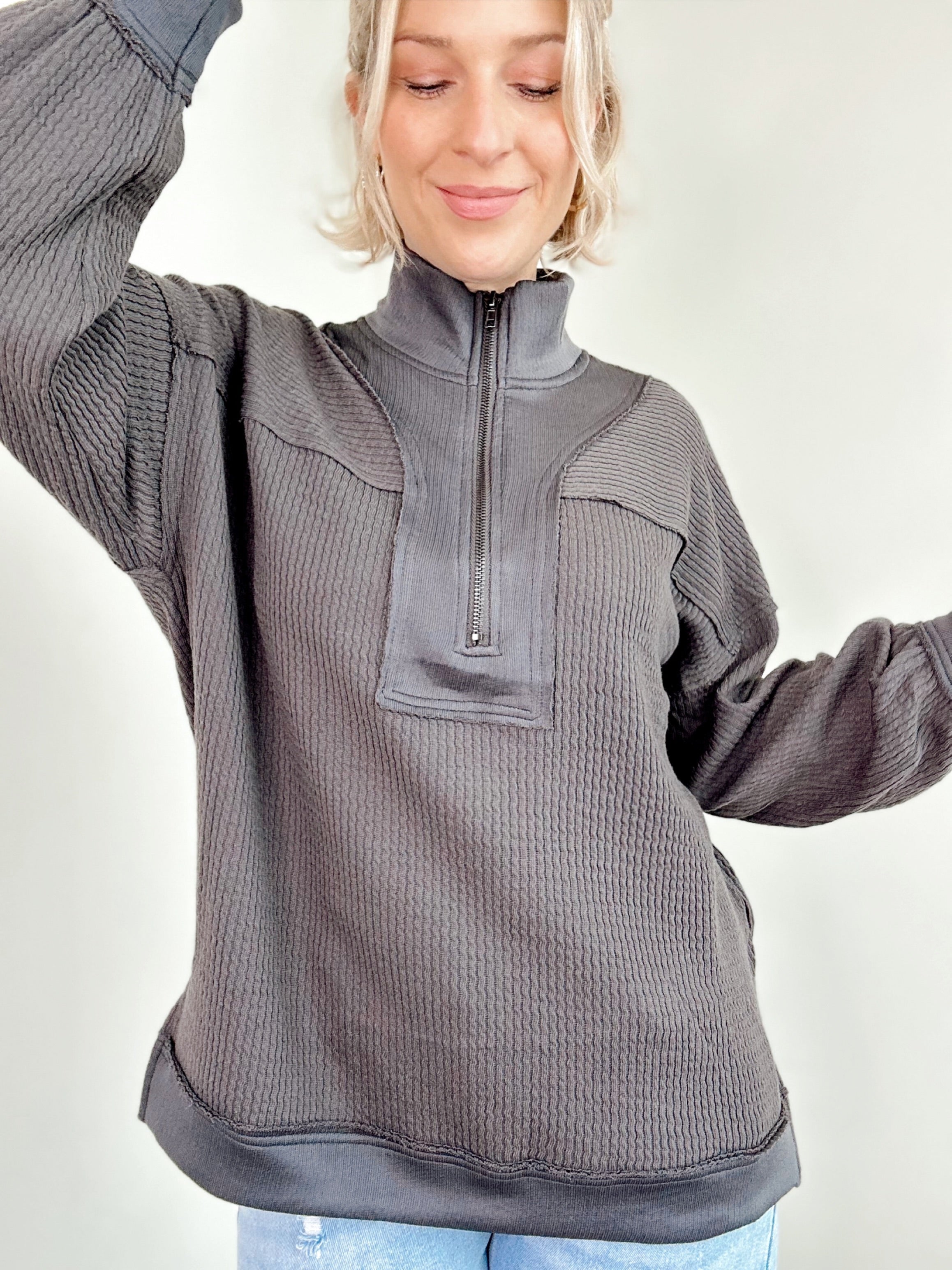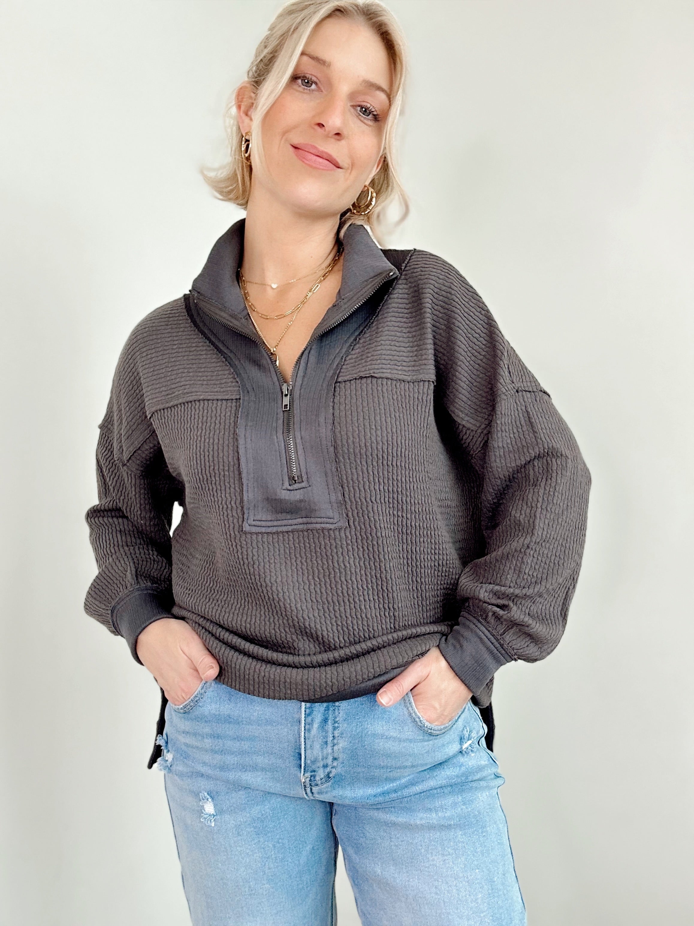 Get cozy in the Joanna Half Zip Waffle Knit Top! This charcoal long sleeve features a playful half-zip collar and a textured waffle knit that's perfect for layering or wearing solo. Soft, comfy, and effortlessly cool—it's your new go-to for chill days and casual adventures.