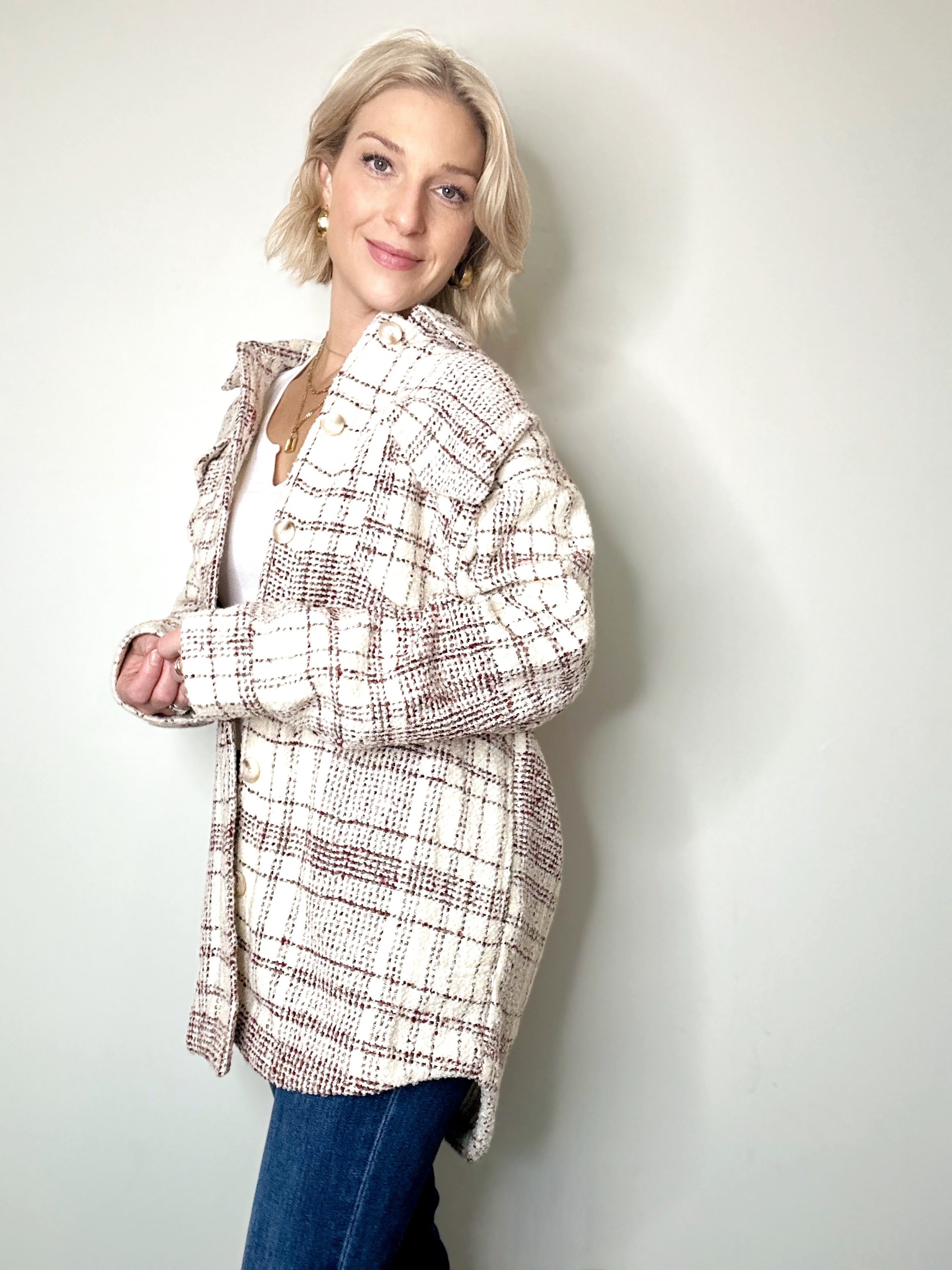Layer this plaid boucle beauty over everything. The Maya shirt jacket features a crisp collar, button-down front, and long sleeves that mean business—but the curved hem and side patch pockets keep things relaxed. Chest pockets add utility, while the longline cut gives you that effortless, oversized vibe. Burgundy and cream plaid on textured knit fabric? That's your new go-to for weekend errands and coffee dates alike.