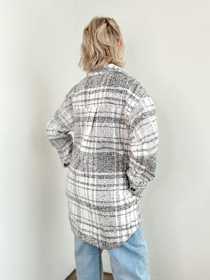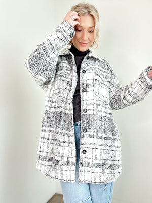 Layer this plaid boucle beauty over everything. The Maya shirt jacket features a crisp collar, button-down front, and long sleeves that mean business—but the curved hem and side patch pockets keep things relaxed. Chest pockets add utility, while the longline cut gives you that effortless, oversized vibe. Burgundy and cream plaid on textured knit fabric? That's your new go-to for weekend errands and coffee dates alike.