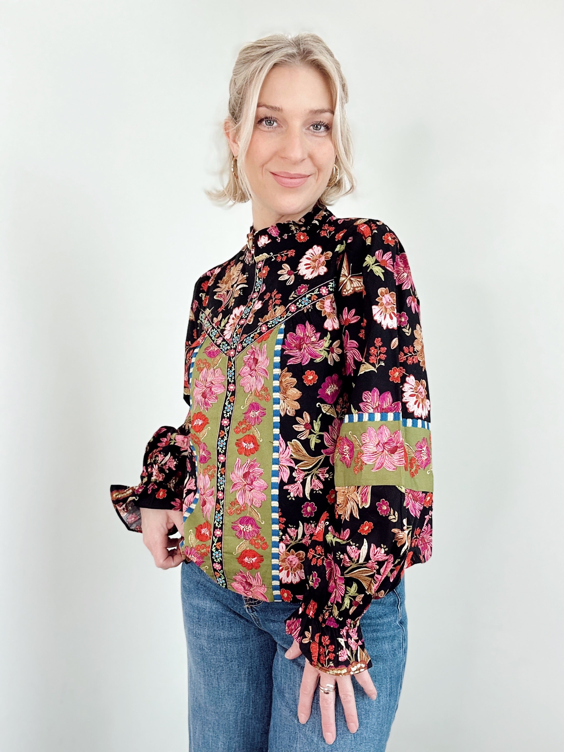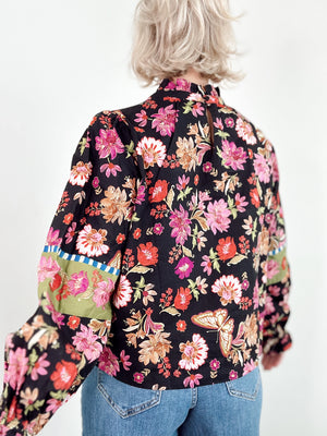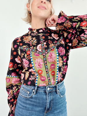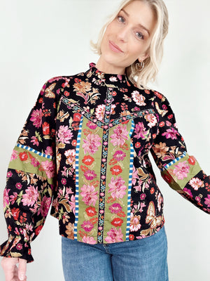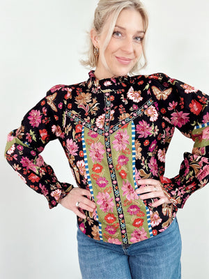 The Marney Floral Print Top is your new go-to for effortless charm. Featuring an exclusive floral border print with coordinating trim details, this top brings personality to every outfit. A ruffled neckline and billowing balloon sleeves with ruffled cuffs add playful movement, while the front bodice trim keeps the design cohesive. Lined for comfort and finished with a sweet keyhole back and button closure. Pure delight in every detail.