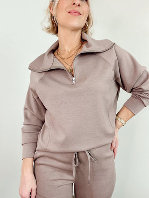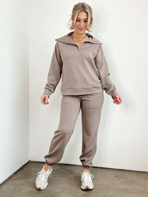 Cozy up in this laid-back two-piece set featuring a scuba half-zip sweatshirt paired with matching joggers. The sweatshirt hits at 24" with a 44" bust (based on size small), while the joggers offer a 26" waist and 27" inseam for that perfect relaxed fit. Perfect for lounging, running errands, or those days when comfort is non-negotiable.