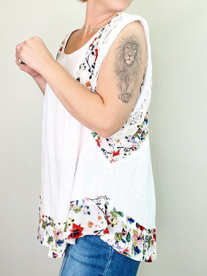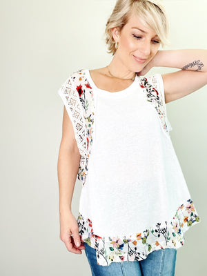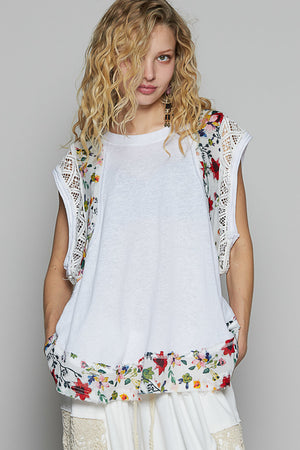Designed in round neck, sleeveless, relaxed fit top in cotton jersey with lace trim detail pointed floral pattern. 100% Cotton