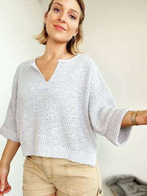 Effortlessly cool and endlessly versatile, the Clara Cropped Sweater brings relaxed sophistication to any wardrobe. The slouchy silhouette pairs perfectly with a V-neckline and three-quarter sleeves for an undone-chic vibe, while solid patches at the front and back add subtle visual interest. Crafted from a breathable acrylic and polyester blend, this lightweight layer transitions seamlessly from season to season—layer it over a tee in spring, wear solo in summer, or throw it on over a dress.