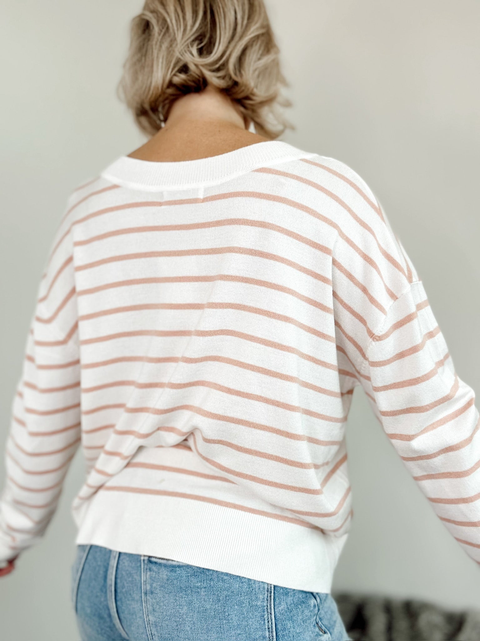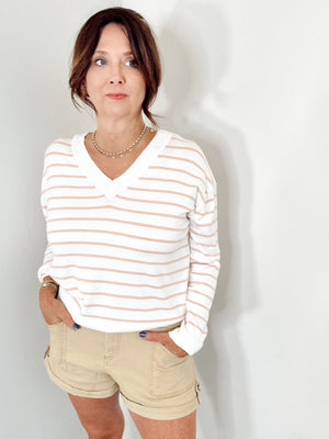 Effortless stripes meet relaxed elegance in this lightweight V-neck sweater. Perfect for layering or wearing solo, it's the kind of piece that works as hard as you do—whether you're heading to brunch or the office. Timeless pattern, modern comfort.