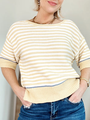 Cozy up in this butter yellow striped knit pullover that's equal parts comfort and cool-girl charm. The drop shoulder silhouette and raw-edge neckline give it an effortlessly relaxed vibe, while ribbed hems and contrast trim details add just enough polish to dress it up or down. Short sleeves and an unlined construction keep things lightweight and breathable—perfect for layering or wearing solo. A modern take on the classic teddy sweater that feels both playful and put-together.