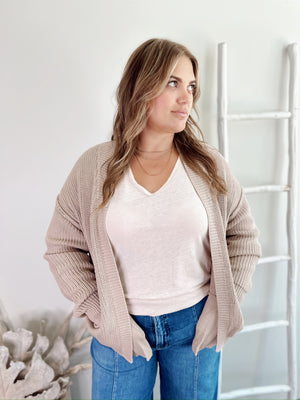 This cozy cardigan features a chunky ribbed knit with handy front patch pockets and an easy open-front design. With raw seam details on the shoulders and a relaxed drop-shoulder fit, it offers an oversized, laid-back vibe that hits right at the hips. Finished with banded cuffs and hem, it’s your go-to for casual comfort and warmth with a playful twist.