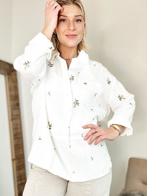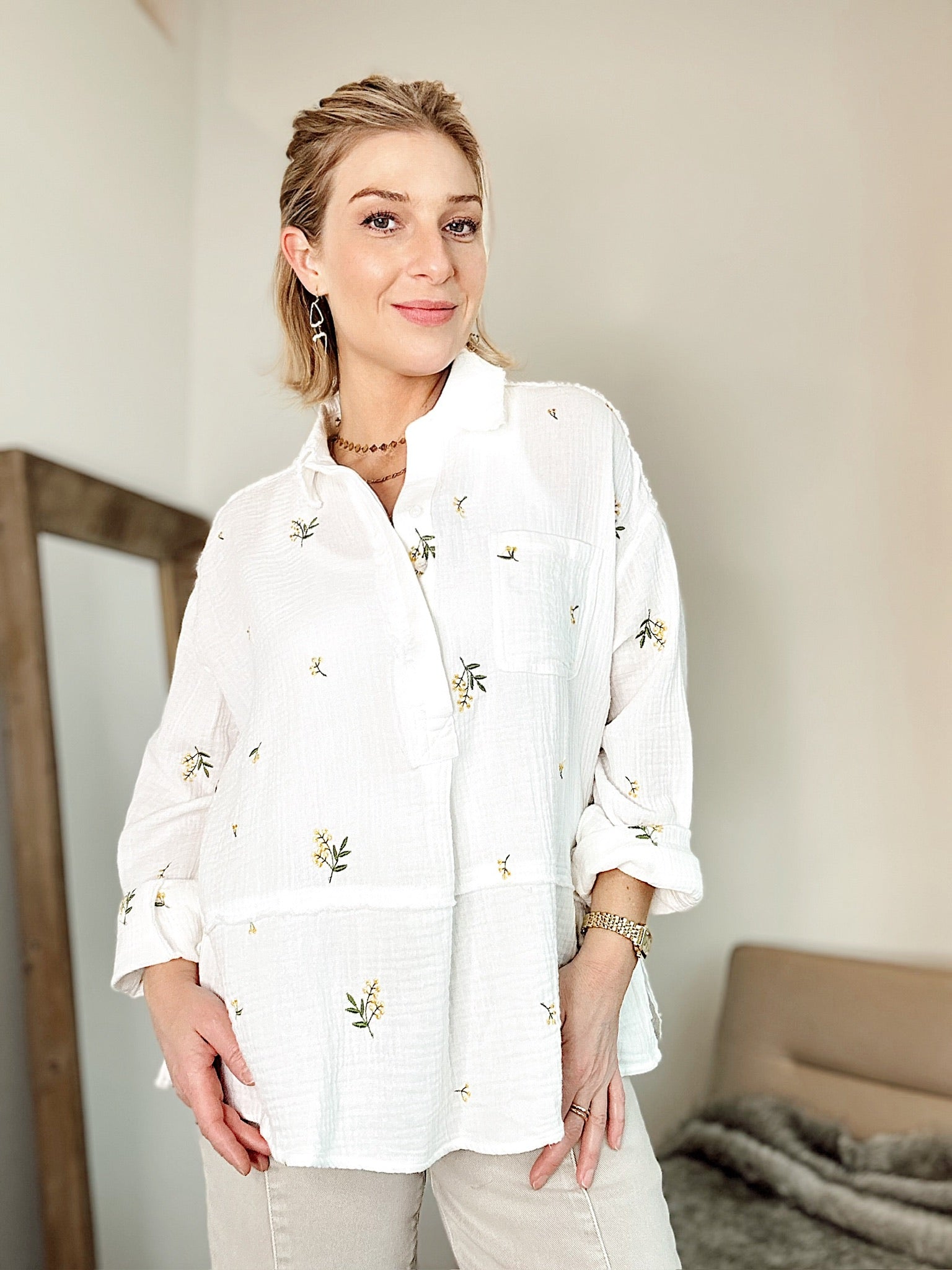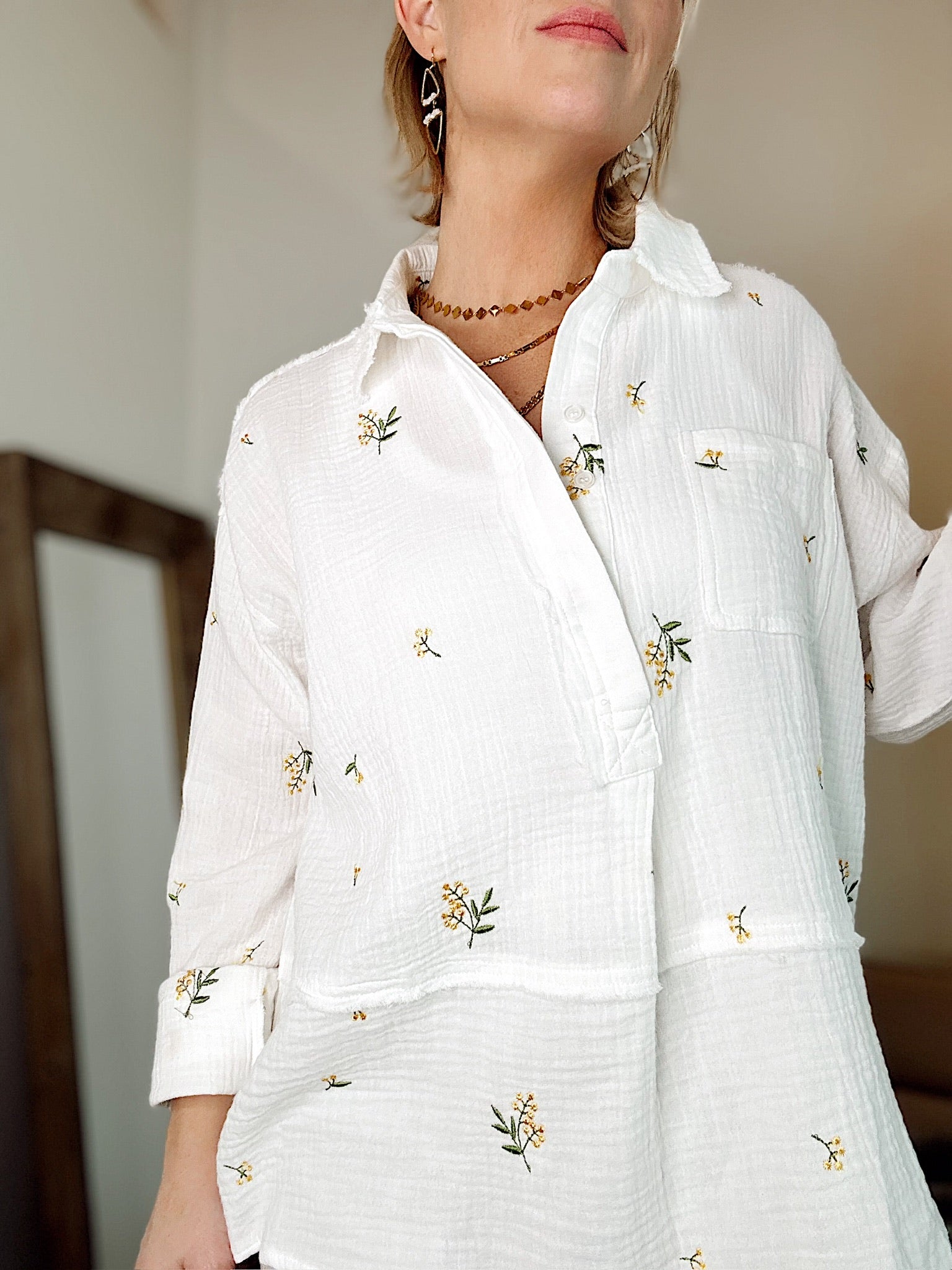 Lightweight cotton gauze meets artisanal charm in this oversized button-front shirt. Delicate embroidery adorns the front, while a relaxed silhouette and side slits keep things breezy and effortless. Perfect for layering or wearing solo—pure comfort with personality.