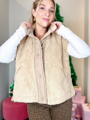 Stay cozy and chic with the Morgan Sherpa Vest, your new favorite layering companion. This playful vest features fun side tie-ups that let you customize your fit while keeping the warmth snug. With a comfy mock neck and easy button-down front, slipping it on is a breeze. Perfect for those in-between days, pair it with slim jeans or leggings for an effortlessly cute look that’s ready for anything—whether you’re out exploring or enjoying a casual city stroll. Made from 100% polyester for soft warmth and lasting comfort.