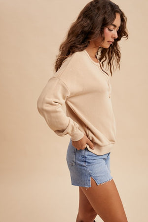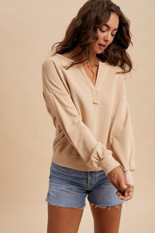 Meet your new wardrobe essential—a relaxed V-neck pullover that's ready for anything. Style it with sneakers and leggings for an easy weekend look, or swap in boots and denim for a polished edge. The soft cotton-poly blend keeps you cozy while a hint of spandex in the ribbed details ensures a comfortable fit that moves with you.