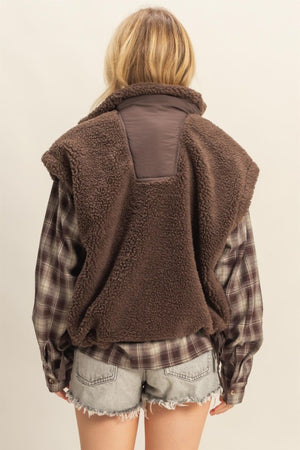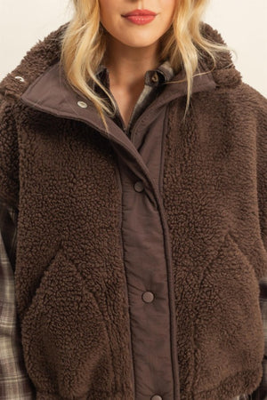 Stay cozy and chic with the Morgan Sherpa Vest, your new favorite layering companion. This playful vest features fun side tie-ups that let you customize your fit while keeping the warmth snug. With a comfy mock neck and easy button-down front, slipping it on is a breeze. Perfect for those in-between days, pair it with slim jeans or leggings for an effortlessly cute look that’s ready for anything—whether you’re out exploring or enjoying a casual city stroll. Made from 100% polyester for soft warmth and lasting comfort.