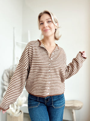 Soft and cozy cardigan in mini stripes - lightweight and rolled edge finish on the sleeves and collar.