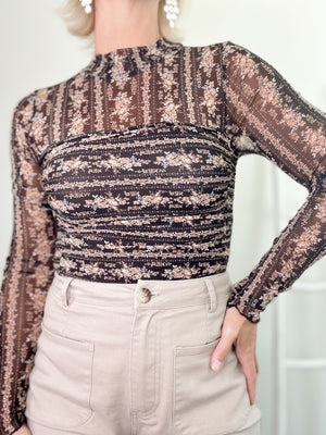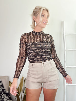 The Izzy Floral Bodysuit brings a playful touch to your wardrobe with its delicate floral mesh and high mock neckline. Long sleeves end in charming lettuce-edge cuffs, while the ruched, layered bodice adds flirty texture. Designed with a fitted silhouette and a thong bottom featuring a snap crotch, it offers both style and comfort. Partial lining ensures just the right amount of coverage for a confident, fun look.