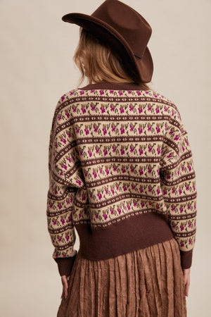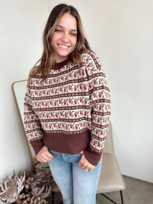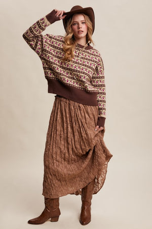 Experience the cozy warmth of a soft brushed wool-blend knit with a plush texture. This sweater shines with a unique jacquard design featuring playful cactus motifs lined up in horizontal rows, bringing a touch of desert fun. Thick ribbing on the crew neck, cuffs, and hem adds a snug, structured finish. Its relaxed, slightly oversized fit with dropped shoulders offers a laid-back, comfy vibe. Available in bold color-blocked trims and tonal mixes, this easy pullover pairs vintage Western charm with modern layering—ideal for jeans, cargo pants, or tucked into a midi skirt for a stylish boho flair.