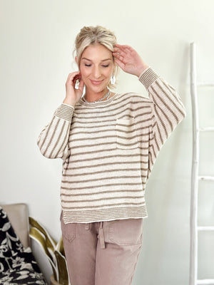 The Selah Waffle Knit Sweater is a lightweight, playful piece crafted from a soft blend of 60% cotton and 40% viscose. Its waffle knit texture and striped pattern bring cozy charm, while 3/4 dolman sleeves and a round neckline keep the look relaxed. Featuring a handy front patch pocket, smaller stripes at the hem, and side slits, this sweater adds fun details to your everyday style.