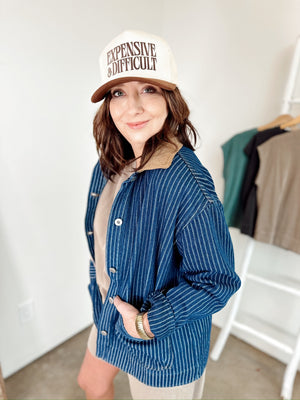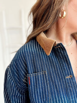 Effortless layering meets vintage charm with the Stella Stripe Denim Shacket. This relaxed-fit essential features a classic collared button-down silhouette in a striped denim pattern, elevated by a contrasting corduroy collar that adds unexpected texture and personality. Unlined for breathable comfort, it's the perfect throw-on piece for casual days or dressed-up weekends. Cotton-blend construction keeps things durable and wearable season after season.
