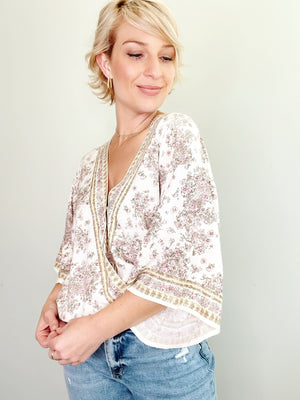 Elevate your chic vibes with this wrap front, kimono sleeve top! Featuring a v-neck and this beautiful border print, it is stylish with a relaxed fit and oh so buttery soft! Light and airy... it's perfect!