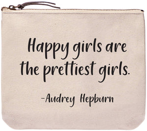 The everyday bags are roomy and wonderfully chic! Made from 100% durable cotton canvas, they come with a gleaming gold zipper and a stylish leather zipper pull. Thanks to a gusseted bottom and dimensions of 9" wide by 7" tall, they add a dash of sophistication. Ideal for holding makeup, nail polish, coupons, money, receipts, office supplies, and much more. After all, as Audrey Hepburn reminds us, happy girls are the prettiest girls!