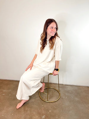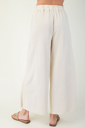 These comfy casual pants are perfect for all day, everyday wear! JoJo pants are featuring Terry knit style fabric, side pockets, elastic waist band with adjustable drawstrings, wide leg silhouette, and raw cut and rolled edge hem. Detailed with ribbed siding and mineral wash coloring. Relaxed and loose fit.