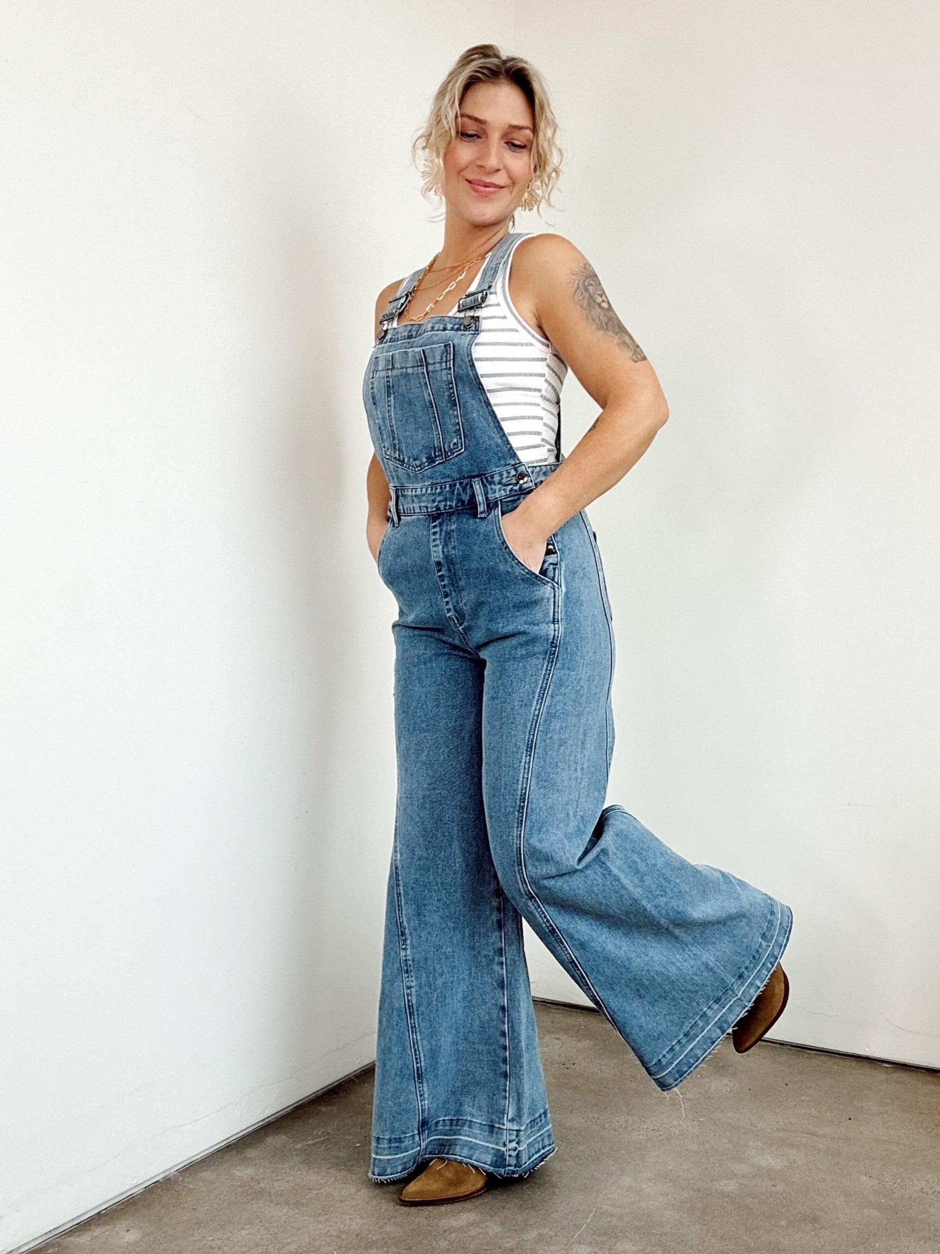 These Gabriella Wide Leg Overalls nail that sweet spot between vintage nostalgia and contemporary cool. The relaxed, flowing silhouette pairs beautifully with everything from fitted tees to chunky knits, while the medium-wash denim keeps things timeless and endlessly versatile. Metal buckle straps adjust to your perfect fit, and practical pockets (hello, front bib!) mean you're never without a place to stash your essentials. Raw hem edges add just the right amount of casual edge, while side button details bring that retro-inspired charm. Whether you're layering for fall or going solo in spring, these overalls are the comfortable, stylish workhorse your wardrobe has been waiting for.