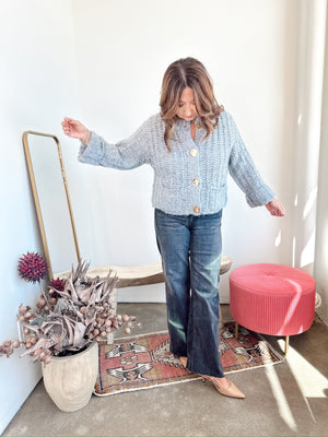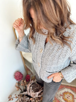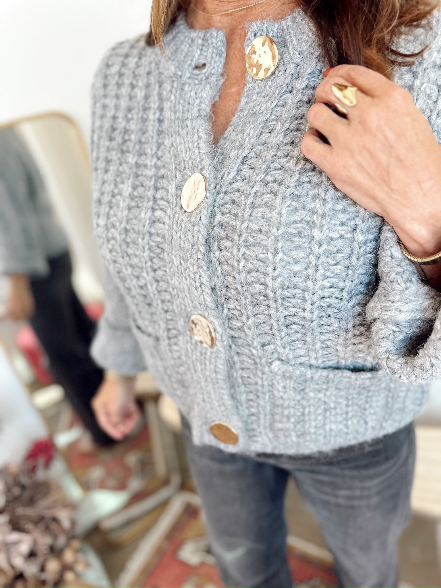 This fun and cozy chunky knit cardigan comes with long sleeves and oversized gold buttons down the front, plus a handy front pocket for a touch of charm and practicality.