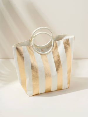 The Mirage Tote - paper straw; double handles; magnetic snap closure; one inner slip pocket. The mirage tote brings vibrant stripes to life with a playful twist and effortless charm. Featuring bold color-blocked panels, a sturdy circular handle, and a spacious interior.