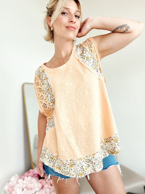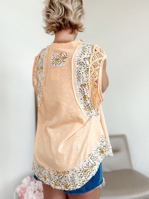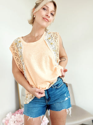 Designed in round neck, sleeveless, relaxed fit top in cotton jersey with lace trim detail pointed floral pattern. 100% Cotton