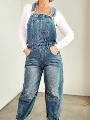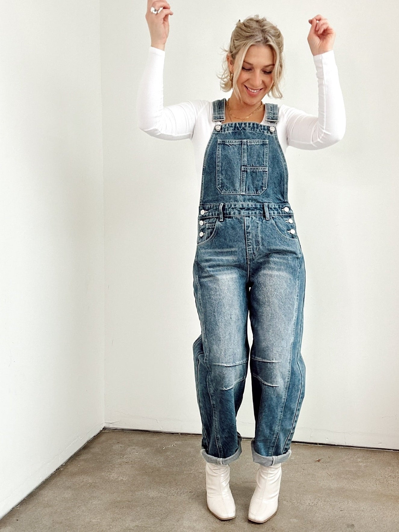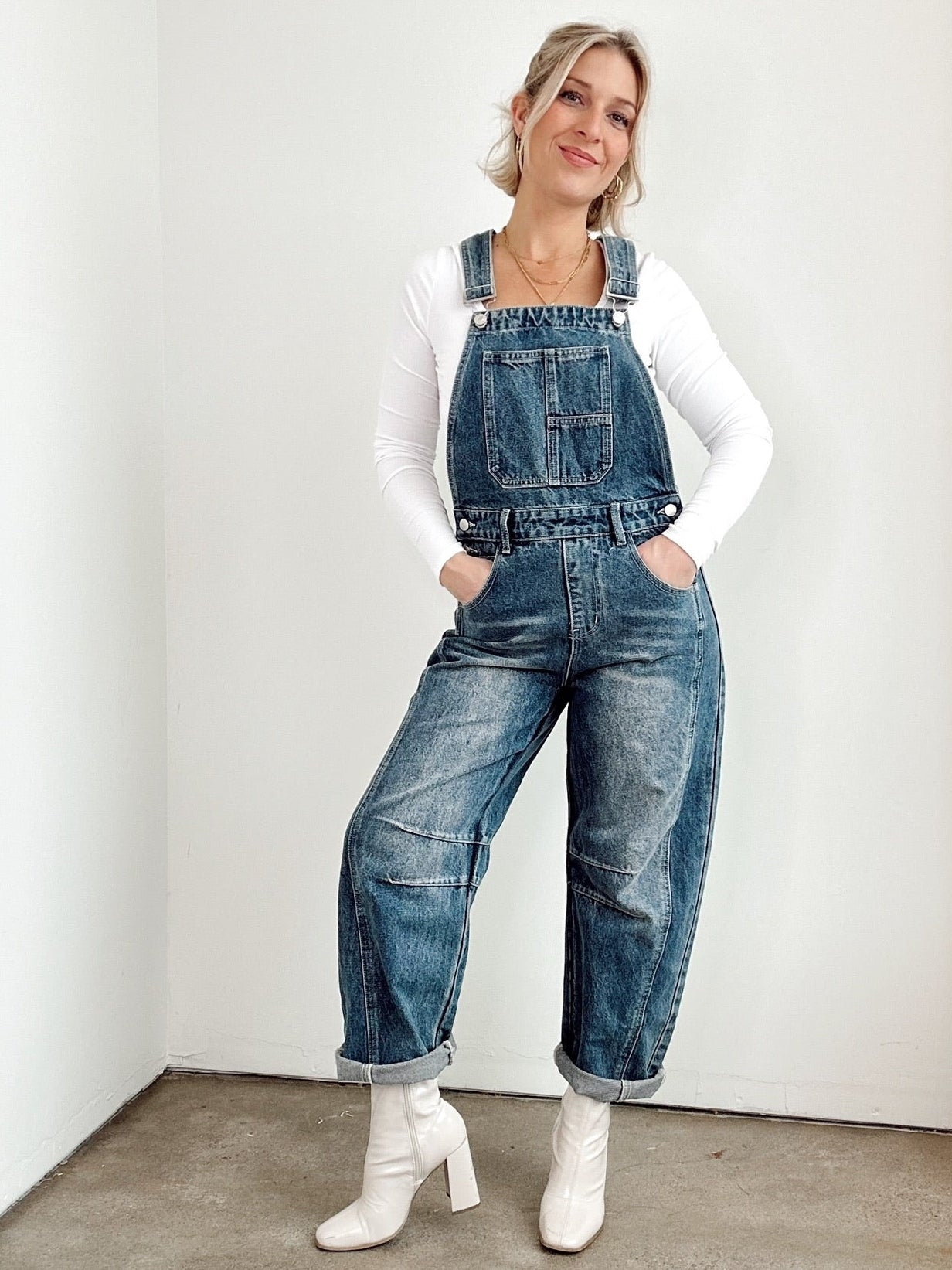 The Rylie Denim Overall offers a comfy, easygoing style with its soft, sturdy denim fabric. Its relaxed, slouchy fit lets you move freely while keeping things cool and casual. Perfect for those who love a laid-back, effortlessly chic vibe.