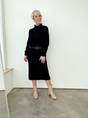 Sweater weather is here and this dress is ready! This turtle neck sweater dress has a ribbed knit texture, midi length and loose fit. It comes with long sleeves and tapered at the wrists.