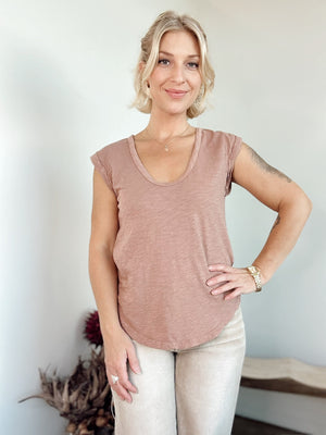 Experience effortless style with our Tillie Tee. This 100% cotton t-shirt features playful details like a raw edge back, yoke seam, and center back seam. The slightly capped short sleeves and v-neckline add a touch of fun, while the round hem falls below the hip for that perfect casual-chic vibe. Your new favorite tee just arrived!