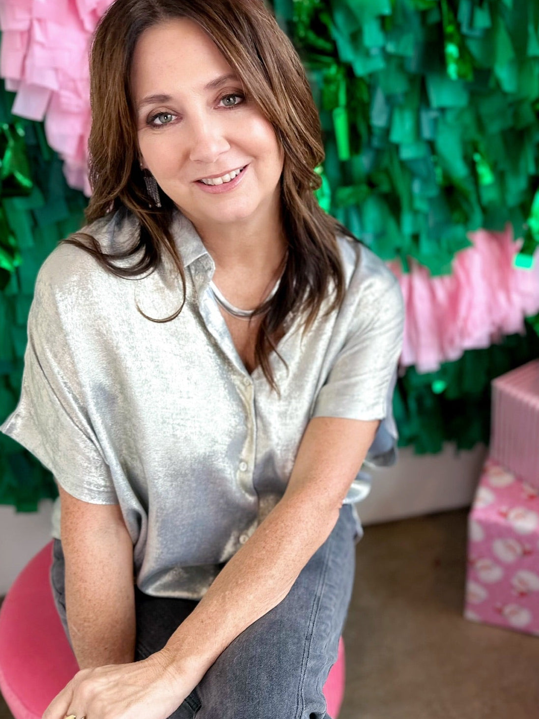 This metallic woven blouse makes everything fabulous. This blouse is featuring a full shell button up, collared top, short dolman sleeves, and slit on side with high to low on front to back. Has a loose and relaxed fit to it. Comes in other colors.