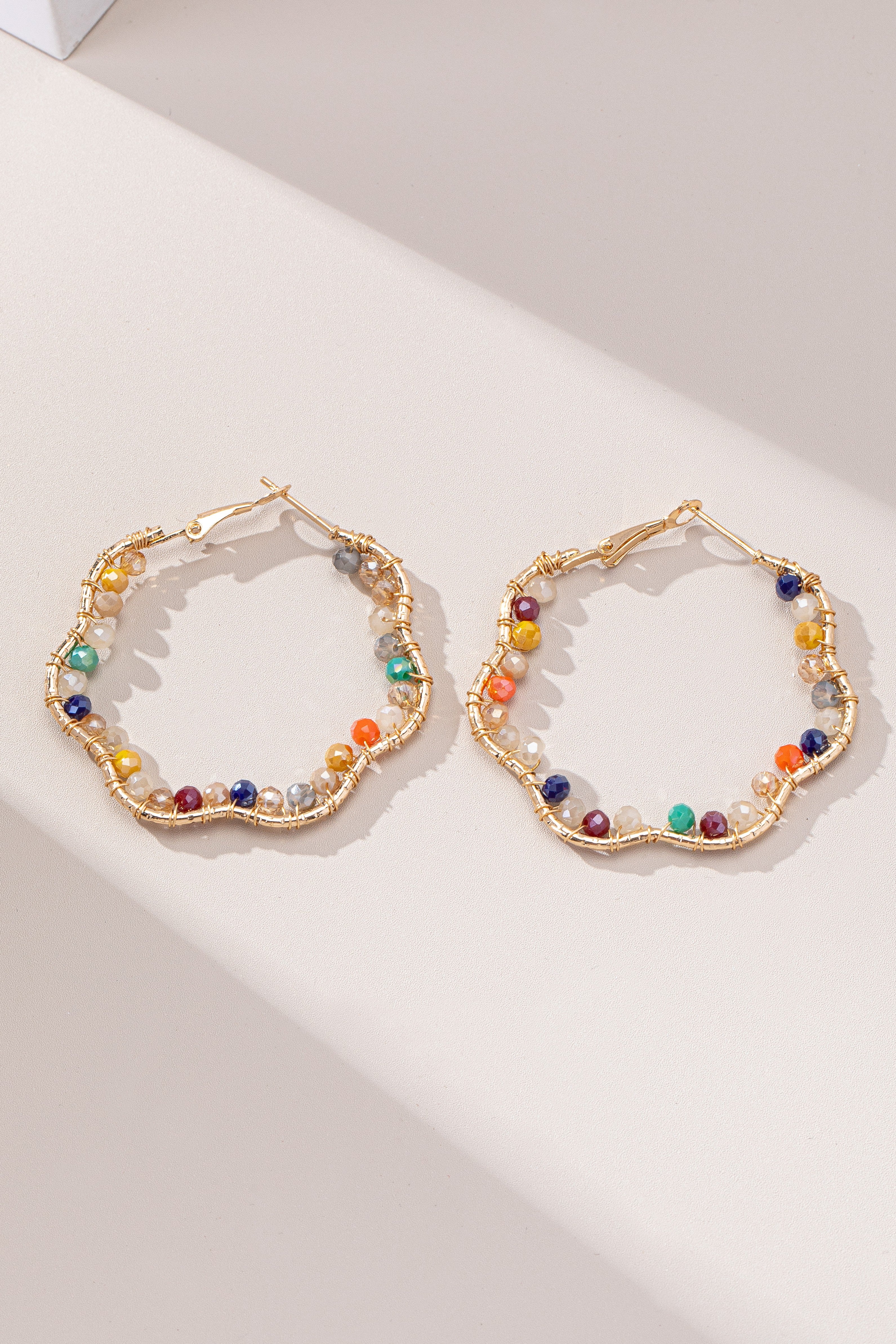 Bring a splash of fun to your look with these wavy gold beaded hoop earrings! Their freeform, wavy shape is dotted with charming beads, blending elegance with a modern twist. Lightweight and easy to wear with a secure latch-back clasp, these hoops are perfect for adding a playful sparkle to any outfit, whether casual or dressy.