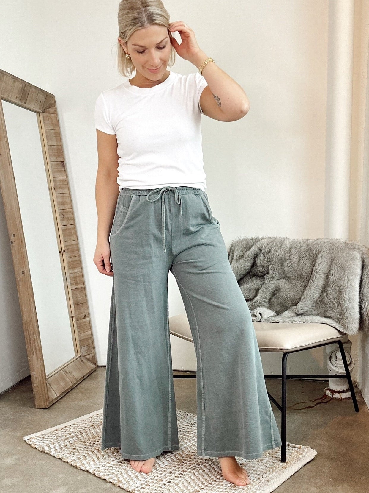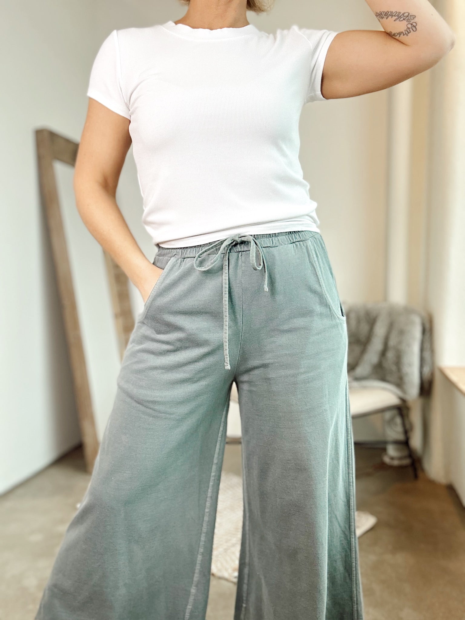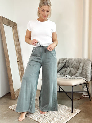 Effortlessly cool French terry pants with a lived-in pigment-dye finish and enzyme wash for that perfectly worn-in vibe. Featuring a drawstring waist and functional pockets, these are made for comfort without compromise. Approx. 26" waist and 26.5" inseam (measured from small).